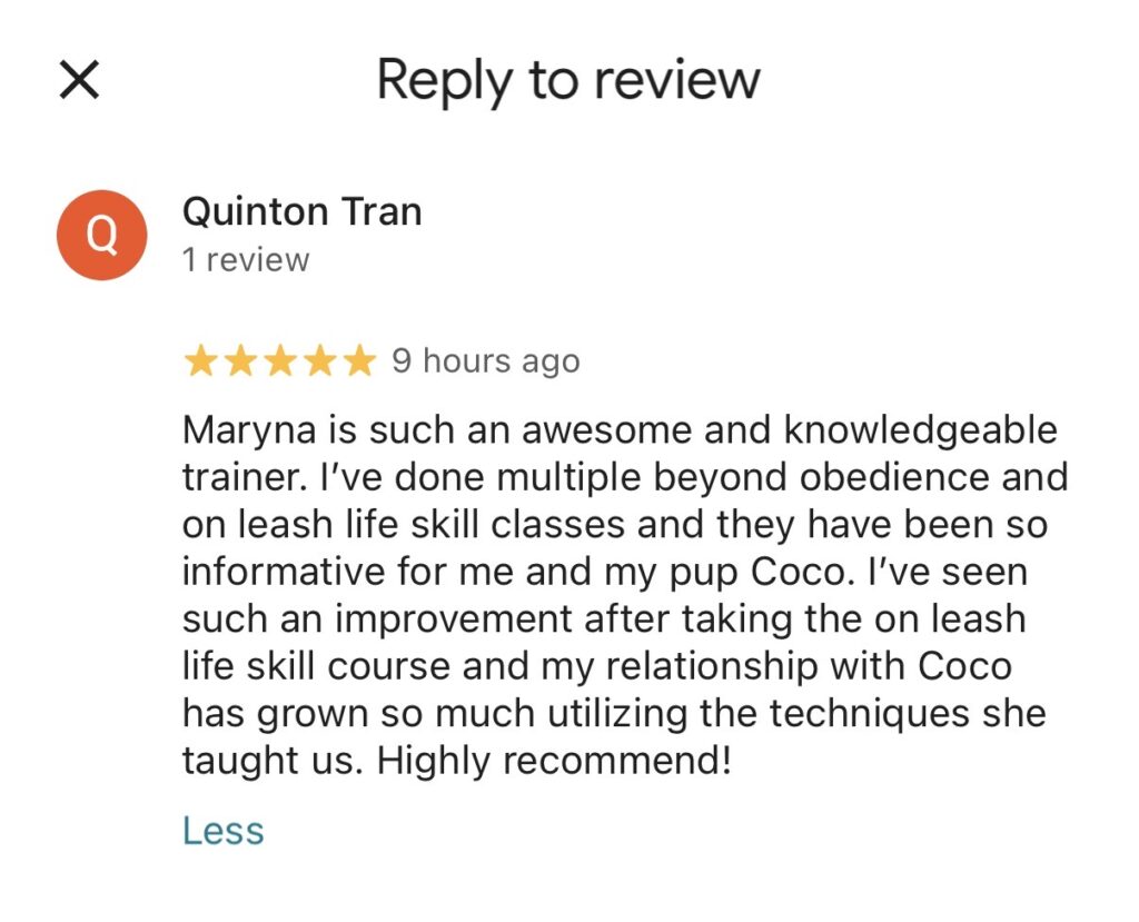 Is this class the right fit for you? If your dog has already built up severe reactivity — meaning intense barking, lunging, or even attempting to bite people or other dogs — this group class may not be the best place to start. This also applies if your dog becomes so overstimulated or fearful that it’s hard to physically control them, or it doesn’t feel safe for them (or others) to be around dogs in close proximity.